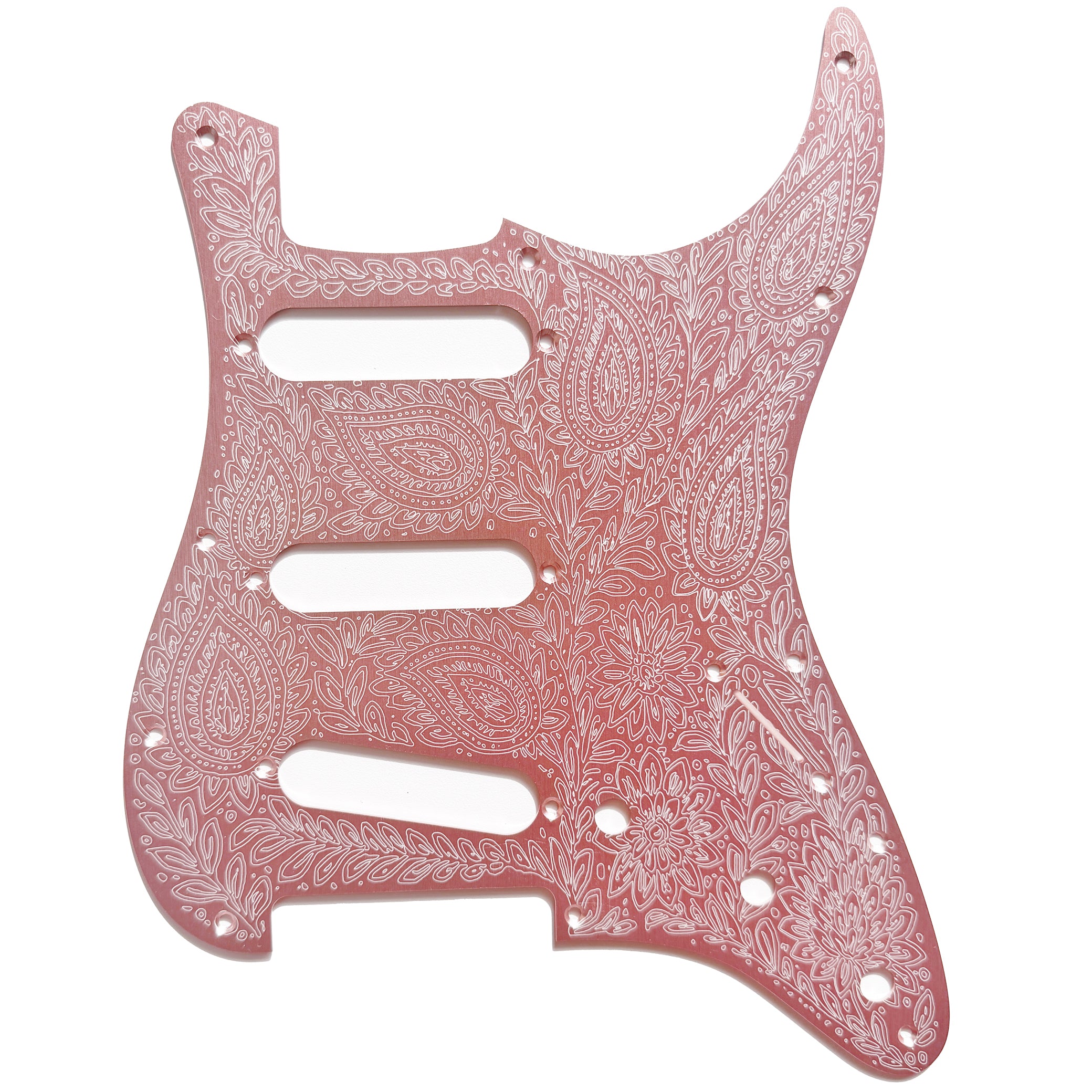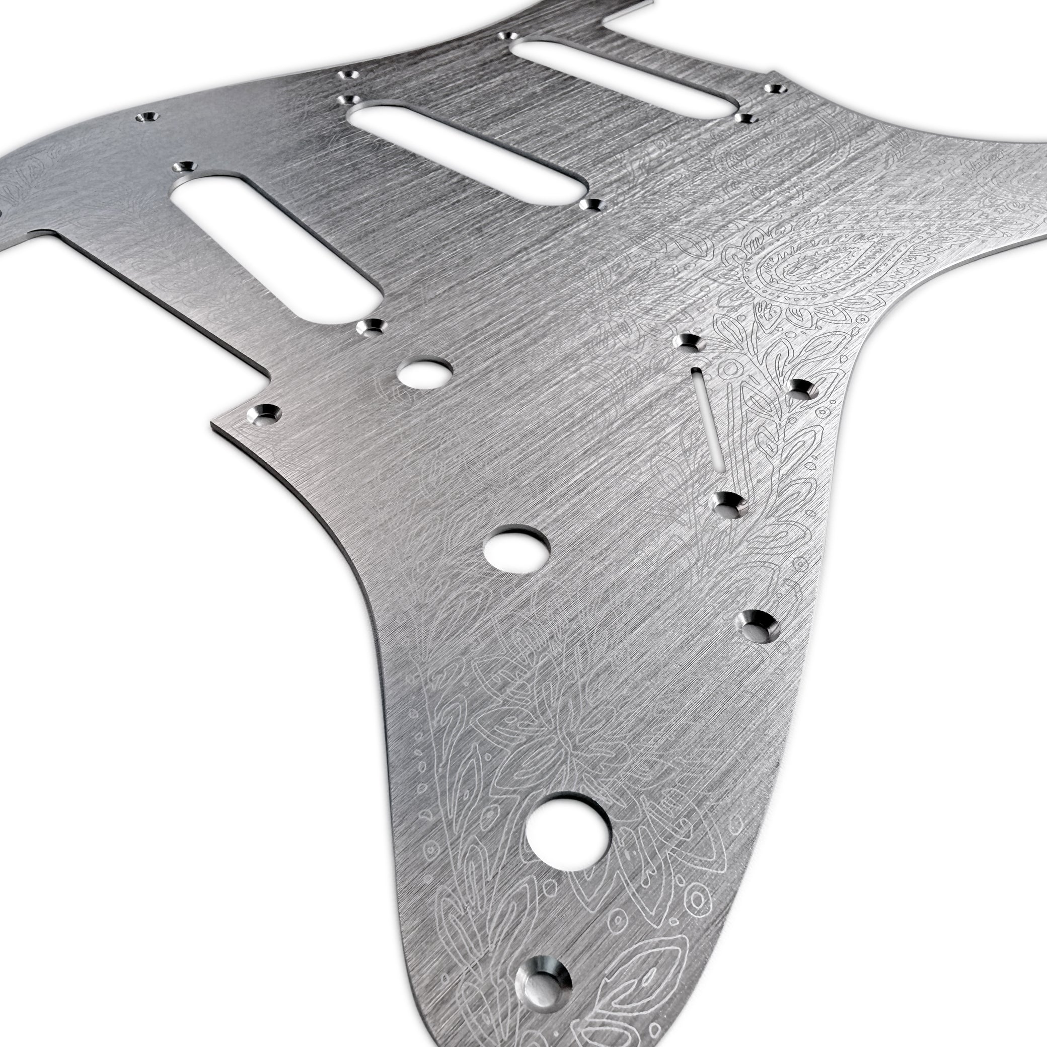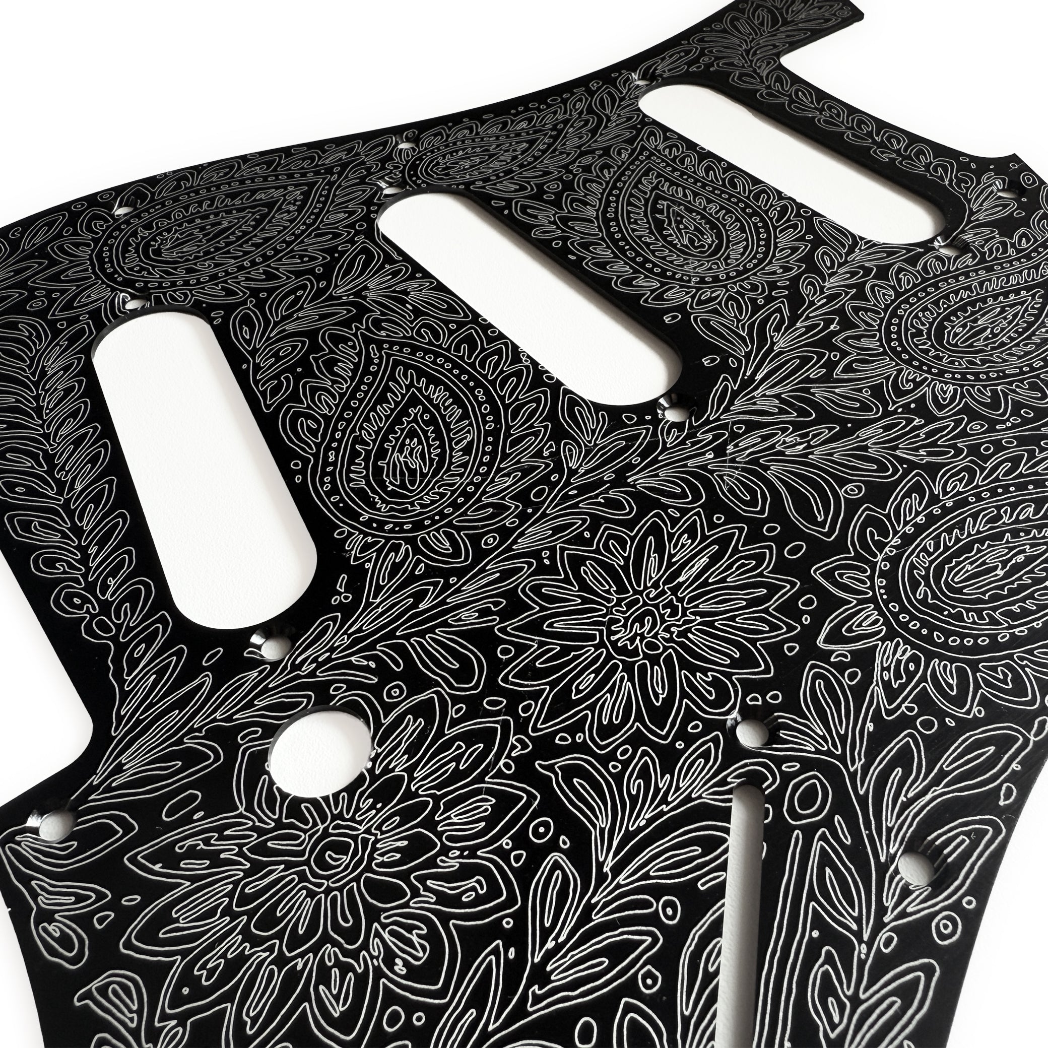 These 1.5 mm thick aluminum Strat-style pickguards are adorned with unique laser-etched white paisley graphics. Standard 11-hole spacing is a retrofit on most modern-style Strats.