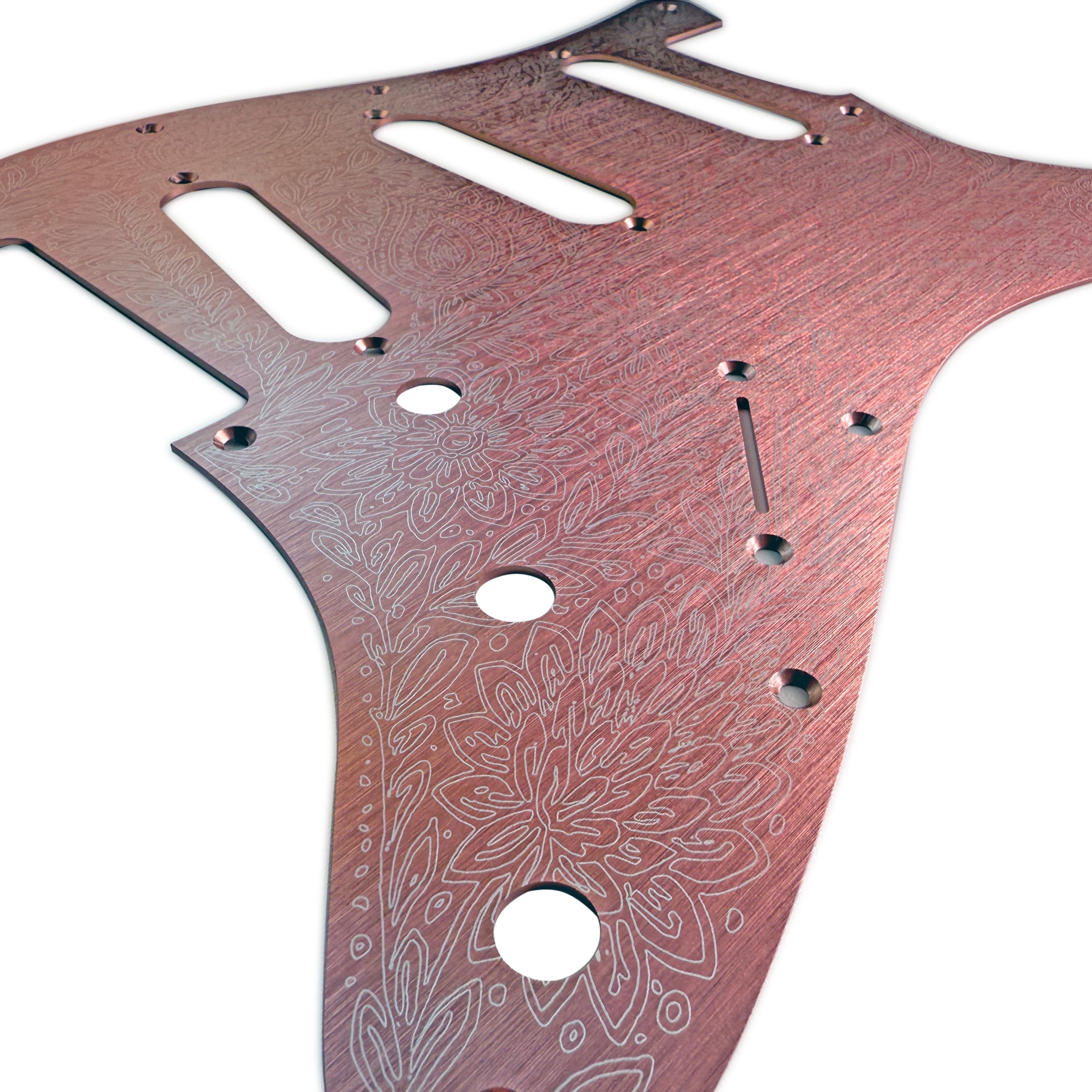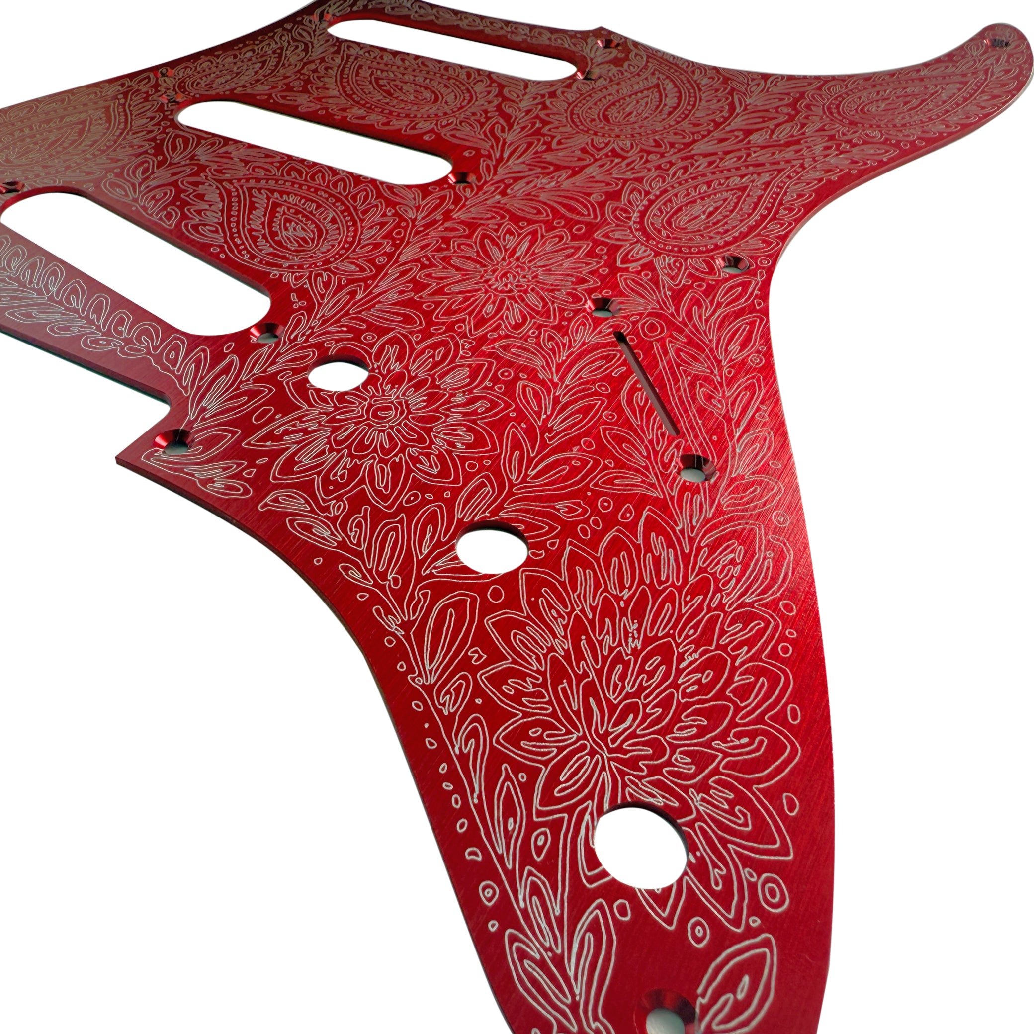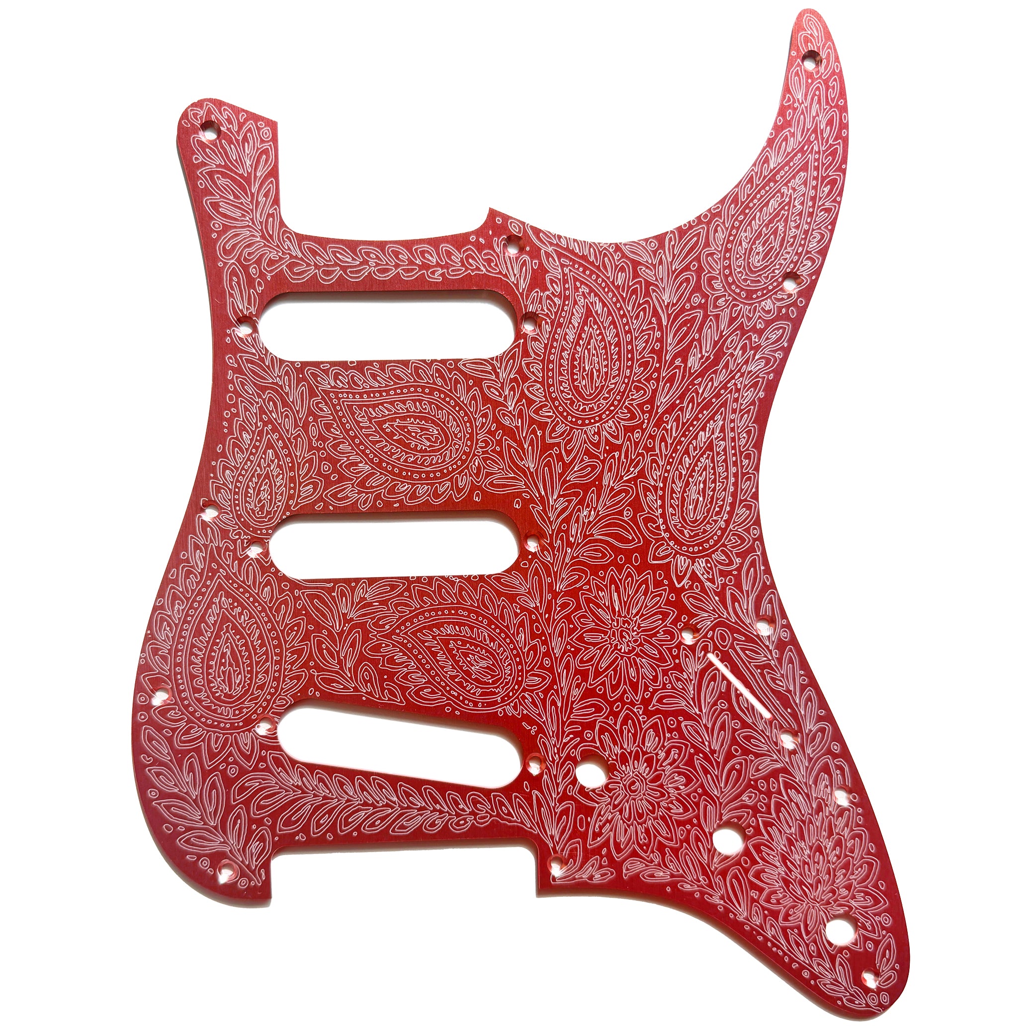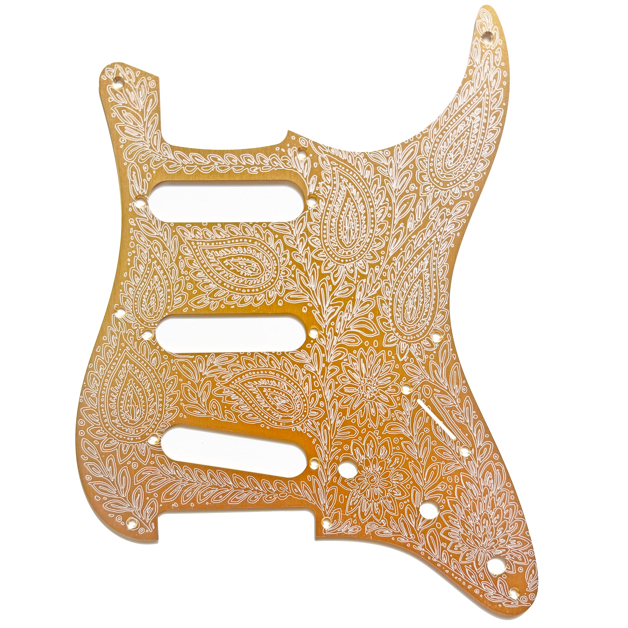 These 1.5 mm thick aluminum Strat-style pickguards are adorned with unique laser-etched white paisley graphics. Standard 11-hole spacing is a retrofit on most modern-style Strats.